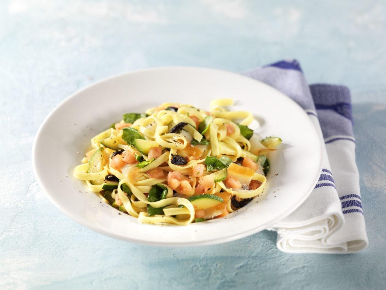 - Währenddessen die Zucchini putzen, halbieren und in dünne Scheiben schneiden. Die Tomaten fein würfeln. Die Basilikumblättchen in grobe Stücke zupfen. Den Knoblauch schälen und in dünne Scheiben schneiden. Den geräucherten Seelachs in Stücke schneiden. Die Oliven nach Wunsch in Scheiben schneiden.