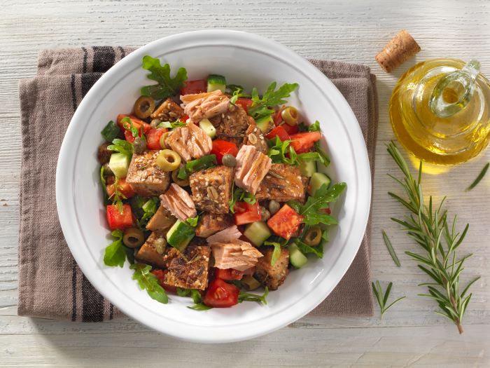 - Kurz vor dem Servieren Brotwürfel, Tomaten, Gurke, Kapern, Rucola und Oliven miteinander vermengen. Thunfisch darauf verteilen und mit dem Dressing beträufeln.