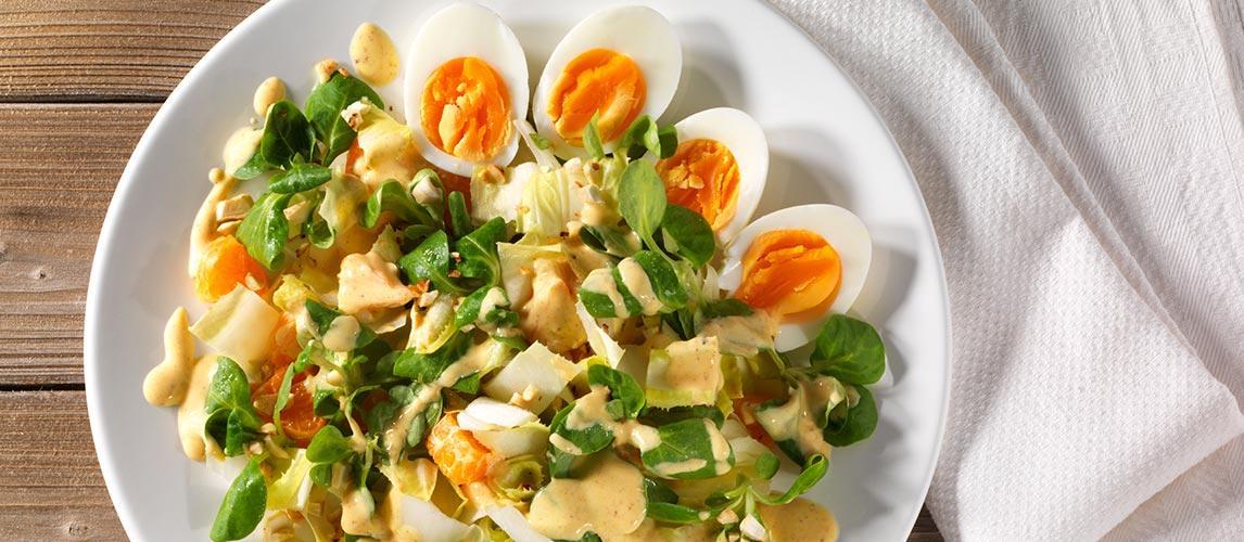 - Chicorée, Feldsalat und Mandarinenstückchen mischen und in zwei Schüsseln geben. Die Eier pellen, halbieren und darauf anrichten. Das Mandarinen-Curry-Dressing darüber verteilen und die Cashewkerne darüberstreuen. Das Vollkornbrot dazu servieren.