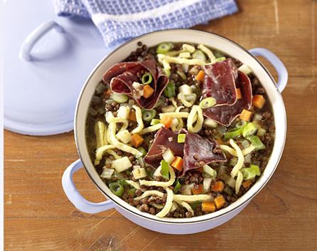 - Den Eintopf mit den gebratenen Zwiebeln und dem Schinken servieren.
