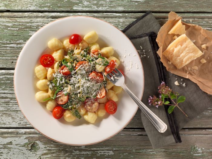 Tipp: Statt Gnocchi können Sie auch Vollkornnudeln oder Spätzle verwenden. Im Winter können Sie statt dem Spinat Grünkohl oder im Sommer Mangold verarbeiten.