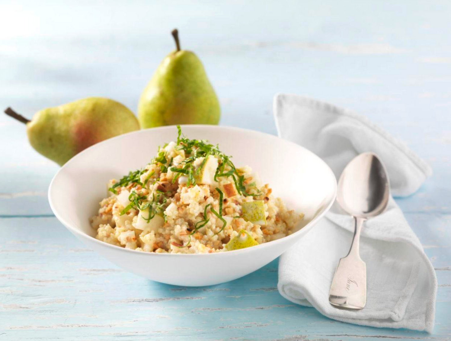 - Hirse, Birnen und Dickmilch-Quark-Masse vermischen und in Schälchen verteilen. Mit der Minze bestreuen.