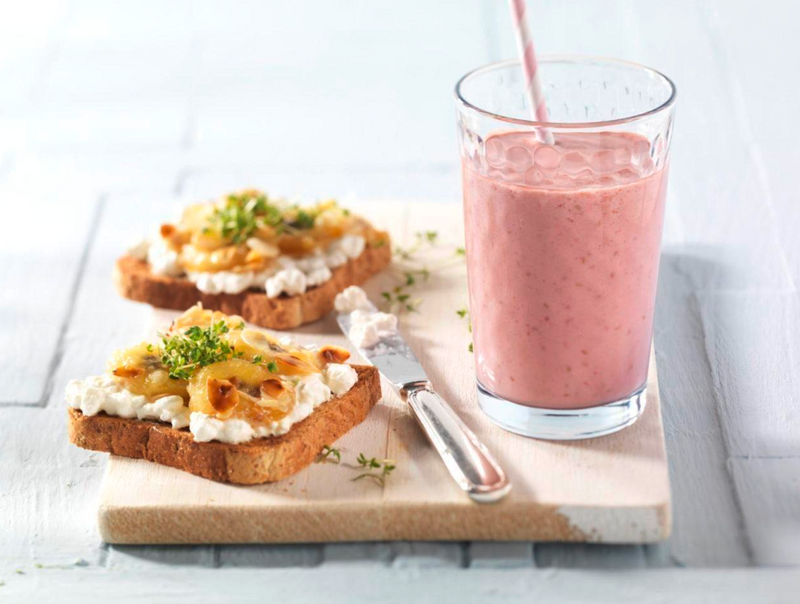 Bananen-Hüttenkäse-Toast mit Himbeer-Orangen-Smoothie