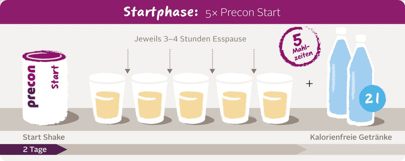 Der Precon Start Shake liefert Dir an den ersten zwei Diät-Tagen ca. 900 kcal pro Tag und bereitet Deinen Körper damit optimal auf die Fettverbrennung vor.