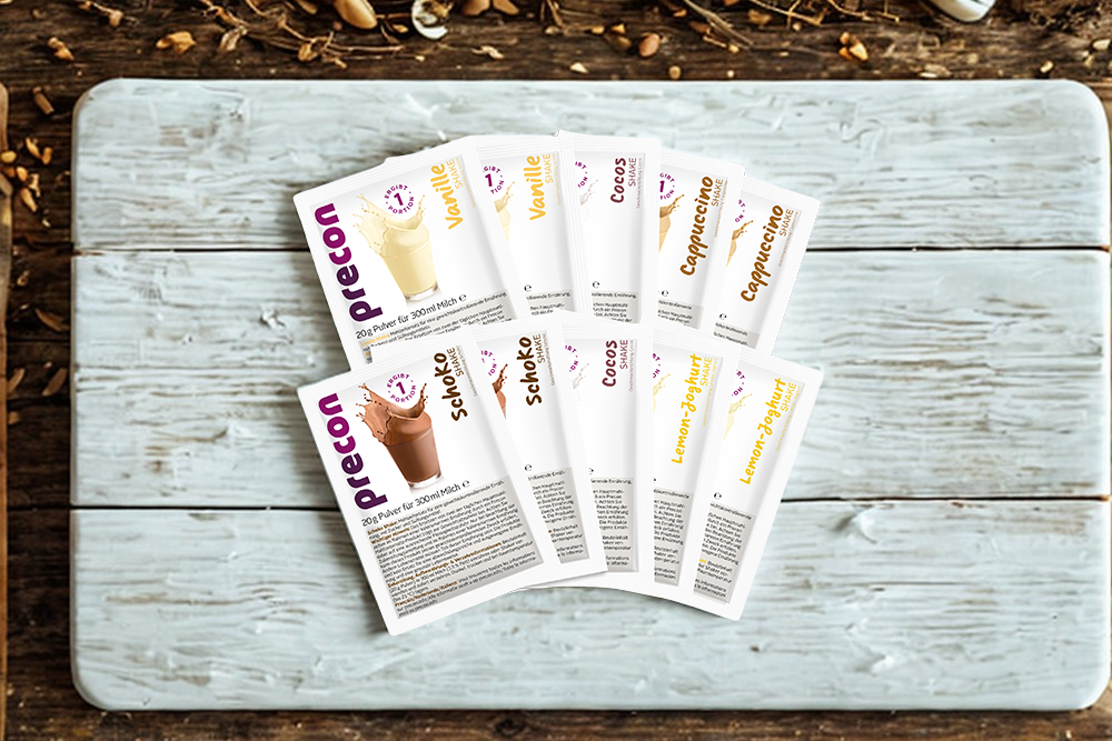 Unsere Shake Mix Box enthält verschiedene Sorten unserer Precon Shakes. Alle Shakes sind nach den gleichen hohen Qualitätsstandards hergestellt und als vollwertige Mahlzeiten im Rahmen der Precon Ernährung geeignet.